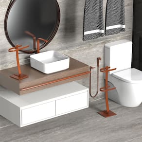 Este kit exclusivo em Rose Gold é composto por duas peças separadas: um Porta Papel Higiênico de Chão com capacidade para 2 rolos e um Porta Toalha de Bancada para Lavabo, ambos com acabamento refinado que combina beleza, modernidade e praticidade.