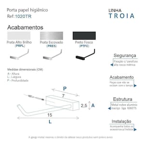 O porta papel higiênico da linha Troia possui um design atemporal, é uma peça que se destaca com imponência e modernidade. Além de decorar, organiza com funcionalidade o banheiro. Criado em metal nobre com uma qualidade que abrange áreas litorâneas e possui a de um acabamento muito resistente. Agora é só você adquirir este lindo acessório e fazer o seu projeto se tornar realidade com um banheiro prático para toda a sua família. Características Fabricado em metal alumínio. Disponível no Prata Alto Brilho, Escovado e Preto Fosco. Pode ser instalado em parede, azulejo e porcelanato. Benefícios Fixação prática e segura com parafusos e buchas inclusos. O produto não possui nenhum detalhe em plástico ABS . Fácil higienização, ideal para locais que exigem limpeza constante. Aproveitamento inteligente do espaço, ideal para ambientes compactos. Resistente à corrosão e luz solar. Itens ENVIADOS: 1 porta papel higiênico, kit de parafusos e manual instrução instalação. Instalação INTELIGENTE Ao 1º furo, use uma broca medida menor, após use a medida correta e finalize, vai ajudar na precisão da fixação da bucha principalmente em azulejos e porcelanato. Marca: Não Informado Ean: 7908165324074