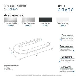 ITENS ENVIADOS: 1 porta papel higiênico, kit de parafusos e manual instrução instalação.