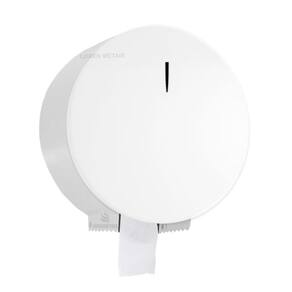 Dispenser para papel higiênico rolão de 400m anti vandalismo, articulação basculante para carregamento da bobina de papel, serrilhado para corte do papel, trava do gabinete - garante abertura apenas com a chave allen. Gabinete em chapa de aço carbono reforçado, espessura de 1,5mm, pintura branca eletrostática lisa com rebites da articulação em alumínio e visor para visualização da capacidade.