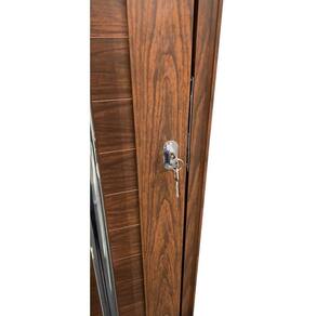 Feita com pintura tecnológica eletrostática que simula madeira, proporcionando um estilo rústico e moderno. A peça acompanha friso, puxador de aço inox de 80cm e fechadura rolete 3F com um par de chaves.