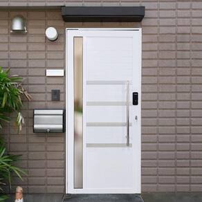 Porta Pivotante de Alumínio Branco Com Puxador, Friso e Vidro com Fechadura Digital Linha 30 - Bergame
