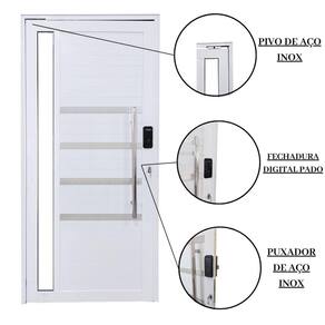 O produto acompanha batente, Friso, Vidro e Fechadura Digital, com 5 cartões de acesso e puxador.