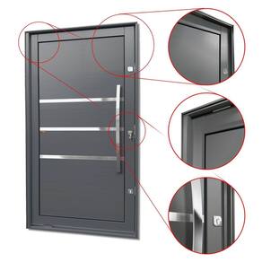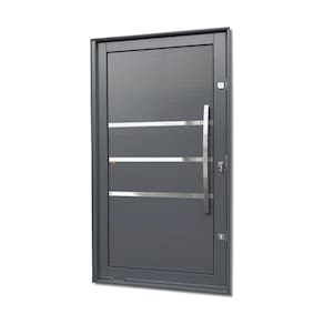 Portas Pivotante de Alumínio, Linha Elite, Pintura Eletrostática Cinza, 1 Folha de Abrir para o Lado Direito, Lambris Horizontais, 3 Frisos Polidos e Envernizados, Puxador Dubai 100 Cm Polido, Altura 216 Cm, Largura 130 Cm, Requadro 11,5 Cm, Garantia de 5 anos contra defeitos de fabricação.