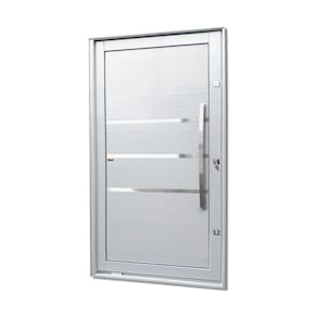 Portas Pivotante de Alumínio, Linha Elite, Pintura Eletrostática Branca, 1 Folha de Abrir para o Lado Direito, Lambris Horizontais, 3 Frisos Polidos e Envernizados, Puxador Dubai 100 Cm Polido, Altura 240 Cm, Largura 130 Cm, Requadro 11,5 Cm, Garantia de 5 anos contra defeitos de fabricação.