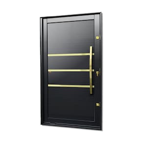 Portas Pivotante de Alumínio, Linha Elite, Pintura Eletrostática Preta, 1 Folha de Abrir para o Lado Direito, Lambris Horizontais, 3 Frisos Polidos, Dourados e Envernizados, Puxador Dubai 100 Cm Polido Dourado, Altura 240 Cm, Largura 150 Cm, Requadro 11,5 Cm, Garantia de 5 anos contra defeitos de fabricação. Ambientes Recomendados: Externo Acabamento do Puxador: Polido Acompanha Batente: Sim Acompanha Dobradiça: 02 Acompanha Fechadura: Sim Acompanha Guarnição: Não Acompanha Manual de Instalação: Não Acompanha Puxador: 01 Altura: 240 Ambiente Principal: Sala de Estar Cor: Preto Cor do Batente: Preto Cor do Produto: Preto Elétrica: Não Escala de Brilho: Fosco Espessura: 11.5 Isolamento Acústico: Não Itens Inclusos: 1 Porta Pivotante Completa, com Batente, Pivots, 1 Fechadura rolete principal e 2 fechaduras auxiliares, Puxador duplo de 100 cm. Lado de abertura: Direita Largura: 150 Largura do Batente: 11.5 Linha ou Coleção: Elite Manual de Montagem e Instalação: https://product-hub-prd.madeiramadeira.com.br/935412/documents/e31a3d52-76c1-4631-b6d4-93504c9b40c693manualesquadriasaluminio.pdf Material da Dobradiça: Aço inox Material do Batente: Alumínio Material do Puxador: Alumínio Necessita Montagem: Não Número de Folhas: 01 Origem do Produto: Nacional Peso: 58 Tamanho: 240cm x 150cm Tipo de Dobradiça: Pivotante Tipo de Parede: Alvenaria Tipo de Porta: Pivotante Tipo de Puxador: Externo Vidro incluso: Não