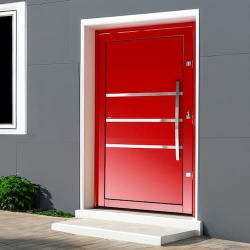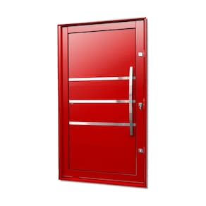 Portas Pivotante de Alumínio, Linha Elite, Pintura Eletrostática Vermelha, 1 Folha de Abrir para o Lado Direito, Lambris Horizontais, 3 Frisos Polidos e Envernizados, Puxador Dubai 100 Cm Polido, Altura 240 Cm, Largura 150 Cm, Requadro 11,5 Cm, Garantia de 5 anos contra defeitos de fabricação.