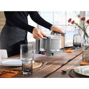 No porta-pratos blum de ajuste contínuo, até 12 pratos ficam firmes na extensão sem escorregar. Os pratos podem ser levados à mesa com segurança. Um prato colocado exatamente sobre o outro: com o suporte para pratos orga-line podem ser salvos no módulo removível, perfeitamente empilhadas e sem perigo de escorregar, até 12 prazos de tamanhos padrão de 180 a 320 mm de diâmetro . Medidas :18x32 material: aço inox e plastico cor: cinza cod. :29607 Marca: Não Informado Ean: 9009494056723
