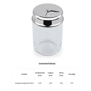 Indispensável em qualquer mesa, o pote para queijo/orégano é uma peça prática e de fácil limpeza, composta por aço inox e vidro. A combinação dos materiais traz um toque de requinte à sua refeição, com uma tampa que possui três aberturas diferentes.