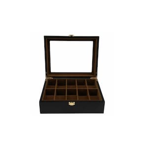 Maleta 10 Relógios em Madeira Escura Tampa Vidro/Marrom Interno CARACTERÍSTICAS DO PRODUTO: Material: madeira escura Interior: Possui almofadas e tecido aveludado Fecho: Feito em metal Tampa: Contorno em madeira com vidro no centro Medidas: Medidas do estojo: 26cm x 20cm x 8cm Comprimento x Largura x Altura Medidas das divisórias: 4.5cm x 9.0cm x 5.0cm Largura x Comprimento x Altura Medidas das almofadas: 4,5cm x 7,3xm x 3,5cm Largura x Comprimento x altura Marca: Ph Martins