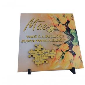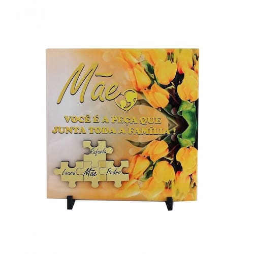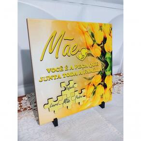 Imagine a emoção dela ao receber um azulejo adornado com peças de quebra-cabeça para combinar, onde cada peça está escrito o nome dos filhos, filhas, de membros da familia E no centro a palavra que une tudo isso MÃE, e a mensagem comovente: Mãe, você é a peça que mantém todos unidos.