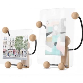 Um porta-retratos exclusivo sustentado por uma linda figura de madeira, o Woody flutua suas fotos entre dois painéis de vidro. A estatueta Woody funciona como um cavalete para a moldura, pois suas mãos e pés são usados para segurar os pedaços de vidro juntos. Exiba o vidro na orientação paisagem ou retrato para caber em uma variedade de fotos ou ilustrações.