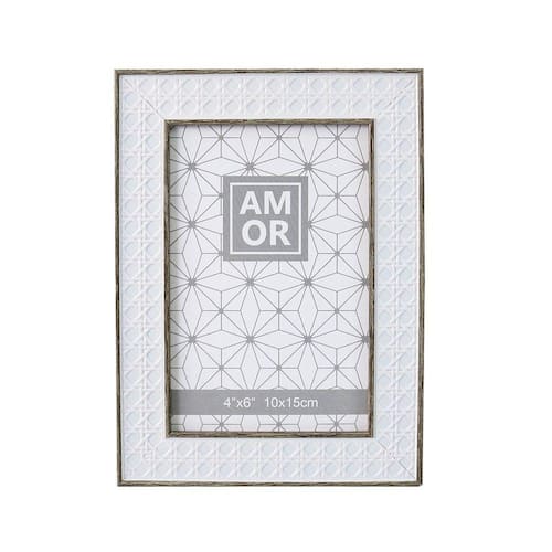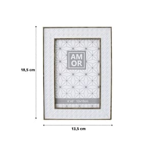 Porta retrato de plástico com detalhes em relevo para fotos de tamanhos 10 x 15 cm.
