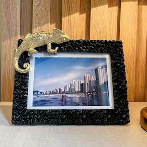 Adicione um toque de charme e sofisticação à sua decoração com nosso porta-retrato preto em resina, adornado com um camaleão dourado. Uma peça que combina arte e funcionalidade, perfeita para destacar suas memórias com estilo.
