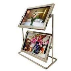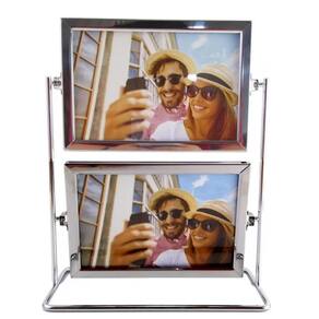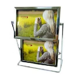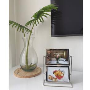 - borda em metal cromado - base giratória - visor em vidro e metal - dimensões aproximadas: 19x37x8cm - capacidade: 4 - para fotos 10x15cm