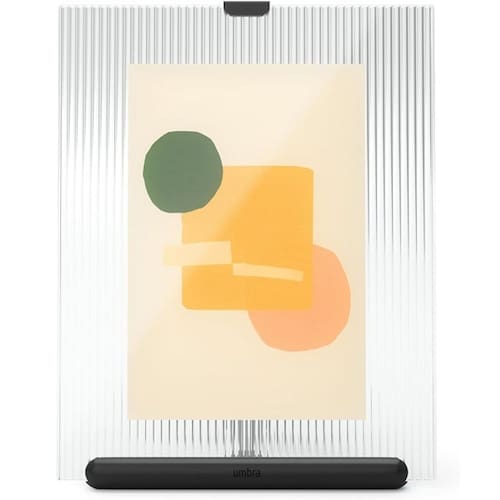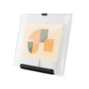 FAZ SUAS FOTOS FLUTUAR: FLUTE é uma moldura flutuante que segura fotos de 4x6 e 5x7 entre dois painéis de vidro com fundo de vidro nervurado.