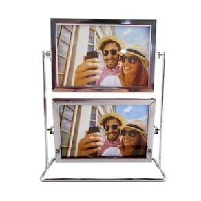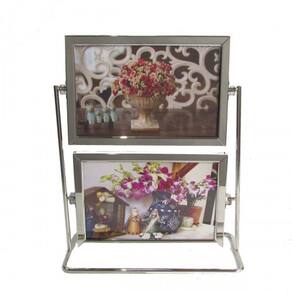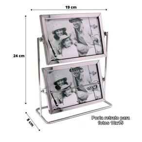 Fabricado em alumínio e vidro, com excelente acabamento, comporta até 04 fotos no tamanho 15x10cm cada. Fácil de montar, não necessita nenhuma ferramenta e seu sistema giratório é uma atração a mais.
