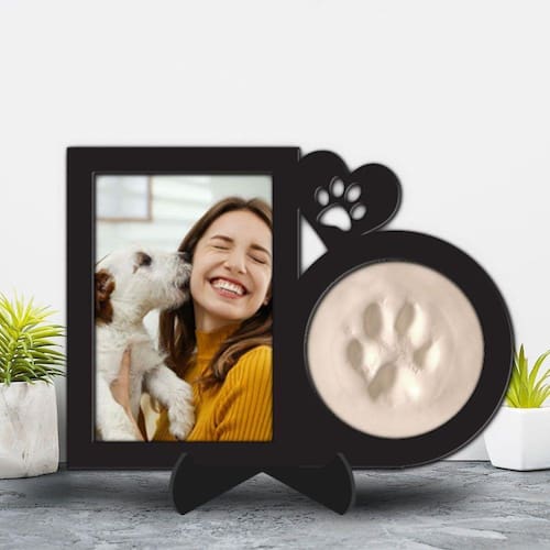De um lado você consegue colocar uma linda foto e do outro o molde da patinha do seu bichinho de estimação.
