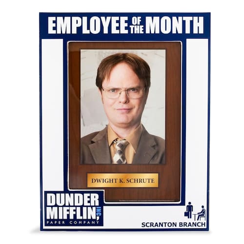 - MOLDURA DE FOTO: Exiba suas memórias favoritas com esta moldura que apresenta uma foto de funcionário do mês (Dwight Schrute) e Dundar Mifflin escrito no final