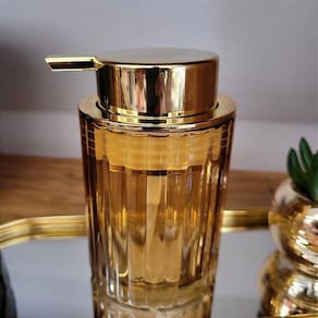 Transforme a rotina diária em um ritual de luxo com o nosso Porta Sabonete Líquido em Vidro Âmbar. Com um elegante relevo e tampa touch dourada, este dispensador não é apenas funcional, mas também um destaque de estilo para o seu banheiro.