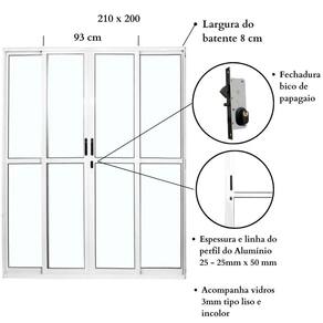 Acompanha vidro de 3mm tipo liso e incolor Vidro: Liso Ambientes Recomendados: Externo;Interno Acompanha Batedor: Não Acompanha Batente: Sim Acompanha Dobradiça: Não Acompanha Fechadura: Sim Acompanha Guarnição: Não Acompanha Manual de Instalação: Sim Acompanha Puxador: Não Acompanha Trinco: Não Altura: 210 cm Ambiente Principal: Sala de Estar codigo_ean: 7898683660214 Cor: Branco Cor do Produto: Branco Cor Predominante: Branco Dimensão da Máquina da Fechadura: 25.0000 Elétrica: Não Escala de Brilho: Semi-Brilho Espessura: 8 cm Espessura do Vidro: 3 mm Isolamento Acústico: Não Itens Inclusos: 1 Porta Lado de abertura: Central Largura: 200 cm Largura do Batente: 8 cm Linha ou Coleção: Linha 25 Manual de Montagem e Instalação: https://product-hub-prd.madeiramadeira.com.br/861570/documents/ce927ef4-04e9-407e-a9ab-32a8aa2bc7fcstruCOesdeinstalaCAobalcAo.pdf Material Principal: Alumínio Necessita Montagem: Não Número de Folhas: 04 Origem do Produto: Nacional Peso: 79 kg Possui Grade: Não Tamanho: 210 x 200 cm Textura da Porta: Lisa Tipo de Parede: Alvenaria Tipo de Vidro: Liso Vidro incluso: Sim Marca: Esquadrias Bergamo Ean: 7898683660214