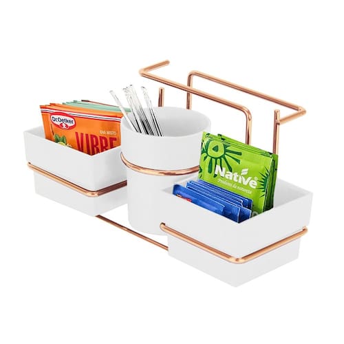 O conjunto para chá e café é prático e funcional, ideal para levar a mesa ou deixar na bancada do café. Os recipientes plásticos são ideais para armazenar saquinhos de chá, sachês de açúcar e adoçante e os mexedores.