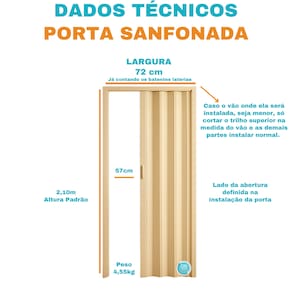 Especificações: É fornecida com trilhos (Laterais e Superior), puxadores, buchas, parafusos, trinco e manual de instruções na embalagem do produto. Altura padrão: 2,10m Largura já com os batentes: 72cm Acompanha Manual de Instalação: Sim Acompanha Puxador: 02 Acompanha Trinco: Sim Ambiente: Interno Composição: PVC Itens Inclusos: 1 Porta, 1 Kit de Instalação e 1 Manual de Instalação. Lado de abertura: Definido na instalação Necessita Montagem: Sim Possui Grade: Não Quantidade de peças por embalagem: 1 Textura da Porta: Lisa Tipo de Parede que pode ser aplicada: Alvenaria, Drywall e Madeira Tipo de Porta: Sanfonada *Não acompanha acabamento/vista/caixilho*