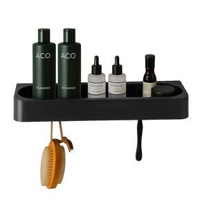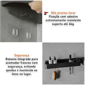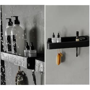 A prateleira de parede horizontal Ou da Linha Eleve oferece fixação segura sem furos, fácil e resistente com o adesivo Ultra Click e é perfeita para otimizar espaços compactos. Com rebaixo integrado, mantém frascos seguros e evita quedas, enquanto os gachos interno discretos permitem pendurar esponjas, escovas de banho e lâminas de barbear. Sua base facilita o escoamento de água.