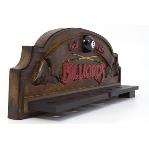 Com o suporte que permite colocar 6 tacos de sinuca comum e um taco com ponta Cruzeta (X). Faz parte do conjunto um suporte inferior, para os tacos. Decoração ideal para salas de jogos, bares com mesa de sinuca, tabacaria e restaurantes.