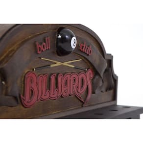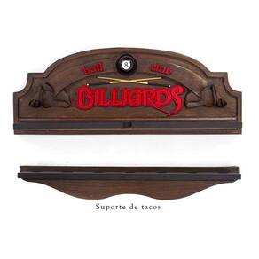 Porta-Tacos Decorativa - Ball 8 Club Billiard + SuportePlaca Porta Tacos Billiard - 224 55 x 25 cm . Placa Porta Tacos Billiard, confeccionada em fibra de vidro, simula uma placa de madeira com os dizeres da marca, Ball Club - Billiards. Com o suporte que permite colocar 6 tacos de sinuca comum e um taco com ponta Cruzeta X . Faz parte do conjunto um suporte inferior, para os tacos. Decoração ideal para salas de jogos, bares com mesa de sinuca, tabacaria e restaurantes. É uma peça com 55 x 25 cm é produzido artesanalmente, pintado nos mínimos detalhes à mão, resulta em um produto de indiscutível qualidade e único. Excelente peça para presentear, colecionar ou decorar escritórios, barzinhos, restaurantes, salas e churrasqueiras.