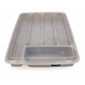 Porta Talheres Com Tampa é uma solução prática para manter seus utensílios em ordem na gaveta da cozinha. Feito de plástico resistente, este organizador possui um design elegante em cinza, adaptando-se perfeitamente às dimensões padrão das gavetas.