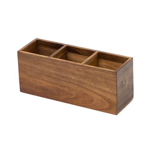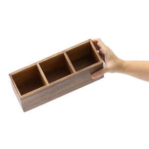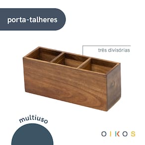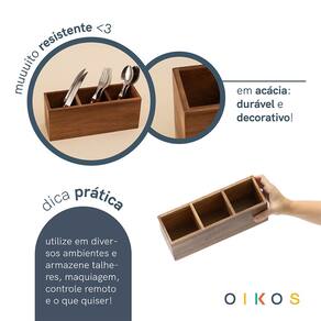 "conheça o porta talheres de madeira acácia com 3 divisórias da Oikos!