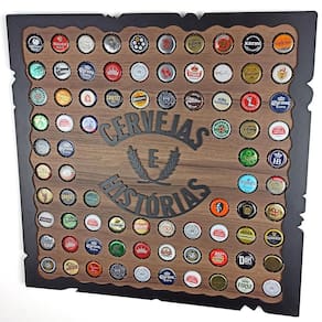 Feito em mdf amadeirado bilaminado de 6mm, tornando a peça bem rústica. Escrita em auto relevo, letras coladas uma a uma. Tampinhas ficam super firmes. Encaixe das tampinhas cortadas á laser, acabamento perfeito. Capacidade para 80 tampinhas Dimensões: 45cm de largura x 45cm de altura x 2cm de profundidade