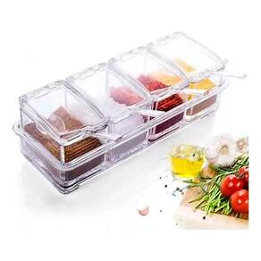 Porta tempero condimentos 4 potes para cozinha casa hotel Descrição Organizadores estilo masterchef gourmet, ideal para temperos, ervas, condimentos, sal, açucar, cafe, leite em pó, cominho, orêgano. Kit com 4 porta condimentos individuais que podem ser destacados para serem levados à mesa individualmente. Ideal para você que quer manter sua cozinha limpa e organizada, sem deixar os temperos e condimentos espalhados. Com tamanho ideal para suas necessidades. Tampa resistente aberta para uso sem queda. Produto que sem dúvidas deixará sua cozinha muito mais limpa, bonita e organizada. Tamanho dos potes Comprimento: 8 cm Largura: 6 cm Altura: 7 cm Itens inclusos: 01 x porta temperos 4 em 1 04 x potes organizadores 04 x colheres para temperos A nossa loja oferece uma seleção de produtos de qualidade e com garantia, prontos para atender as necessidades. Nosso objetivo é sempre oferecer a mais alta qualidade e satisfação dos nosso clientes. Boas compras