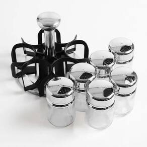 Porta Tempero Condimentos Saleiro 6 Potes Redondo Giratório Cor: Prata Porta Condimentos com 6 recipientes em vidro. Temos duas cores disponíveis dourado e prata e basta selecionar a cor de sua preferência antes de enviar para o carrinho de compras.