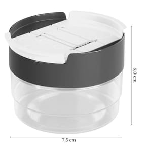 Recipiente plástico para armazenamento de alimentos com capacidade para 140 ml. Ideal para acondicionar temperos. Possui tampa com rosca e 2 sobre-tampas com aberturas independentes, facilitando a dosagem durante o uso na cozinha. É produzido em material atóxico e livre de BPA.