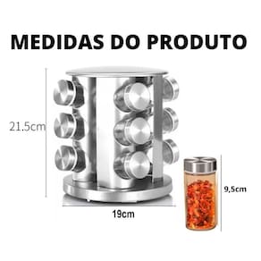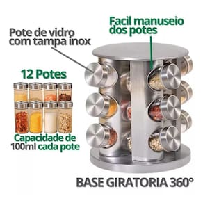 Porta Tempero Giratório 360 com 12 Potes de Vidro e Suporte Inox Organize seus temperos com praticidade e estilo O Porta Tempero Giratório 360 é a solução perfeita para quem busca otimizar o espaço na cozinha e manter seus temperos sempre ao alcance das mãos. Com 12 potes de vidro de alta qualidade e um suporte elegante em inox, esse organizador oferece não só funcionalidade, mas também um toque moderno ao ambiente. Características: Design Giratório 360: Permite girar facilmente para acessar qualquer tempero, oferecendo praticidade e conveniência durante o preparo de suas receitas. 12 Potes de Vidro: Os potes de vidro são ideais para armazenar temperos, pois garantem que os ingredientes se mantenham frescos e protegidos da umidade. Suporte em Inox: A base e o suporte em aço inoxidável são resistentes, duráveis e de fácil manutenção, combinando com qualquer estilo de cozinha. Praticidade no Dia a Dia: O formato compacto e funcional do porta temperos ajuda a economizar espaço no seu balcão, mantendo tudo organizado e acessível. Facilidade de Identificação: Os potes têm um design simples e eficiente, que pode ser facilmente identificado visualmente, ou você pode personalizá-los com etiquetas para tornar a organização ainda mais prática. Especificações: Quantidade de Potes: 12 Capacidade dos potes: 100g Material dos Potes: Vidro de alta qualidade Material do Suporte: Aço inoxidável Altura: 21,5 cm Largura: 19 cm Peso Aproximado: 1,9 kg Incluso: 1x Suporte, 12x Frasquinhos, 12x Adesivos e uma Canetinha O Porta Tempero Giratório 360 não é apenas um item funcional, mas também um acessório sofisticado que vai agregar mais organização e estilo à sua cozinha. Perfeito para quem gosta de praticidade sem abrir mão do design. Marca: Não Informado Ean: 7894037004949