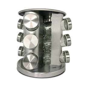 Prático Elegante Feito com Aço Inoxidável e Vidro Tampas equipadas com peneira Base Giratória 360 graus 12 Potes Medidas do suporte: Altura - 22,5 cm Largura - 19,5cm Profundidade - 19,5cm Medidas dos potes: Altura - 9,5cm Diâmetro - 4cm