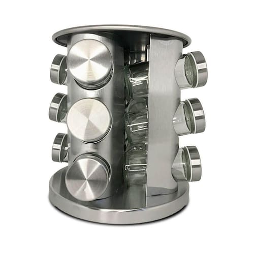 Este carrossel de temperos com aço inoxidável mantém seus temperos, todos armazenados em potes de vidro para facilitar a visualização do conteúdo e dos níveis de preenchimento. Fácil de reabastecer e reutilizar ao longo do tempo. A base giratória permite um movimento completo de 360 graus para que você possa escolher facilmente o que precisa para dar a melhor forma à sua comida, Cada frasco é equipado com uma peneira que permite um tempero controlado e preciso, exatamente como você deseja. Fáceis de limpar, todos os 12 potes de vidro são cobertos por tampas de aço inoxidável, para manter sua cozinha limpa e seus temperos bem conservados.