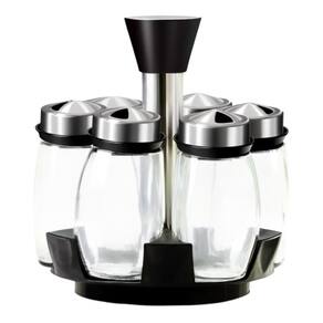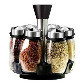 Conjunto organizador de condimentos composto por suporte central giratório e seis recipientes. O produto é fabricado em aço inox, vidro e polipropileno (PP). Cada frasco possui capacidade volumétrica de 120ml e tampa com sistema de tripla furação para controle de saída do conteúdo (sal, grãos ou especiarias). A base rotativa permite o movimento circular dos frascos ao redor do eixo central. Medidas: 18,7cm de altura por 15,7cm de diâmetro. Peso aproximado de 1,1kg.