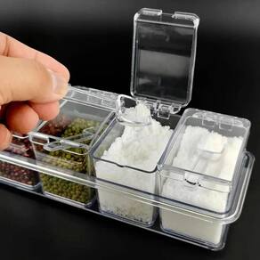 Ele possui 4 potinhos de acrílico transparente que já vão acompanhados de 4 colheres para facilitar o uso na cozinha.