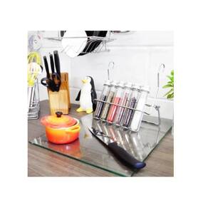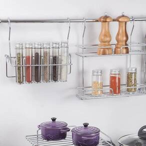 Porta Temperos com 6 Tubos pet Este produto é confeccionado em aço cromado.Acompanha 6 tubos pets com tampas em alumínio e dosadores.Para uso em barra de sustentação da linha redonda e acompanha trava de apoio para uso em bancada também.Fabricante:Jomer Medidas totais: 260 x 235 x 75 mmMaterial:Em Aço Cromado