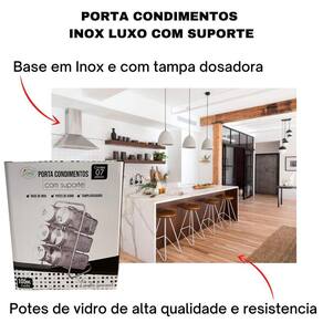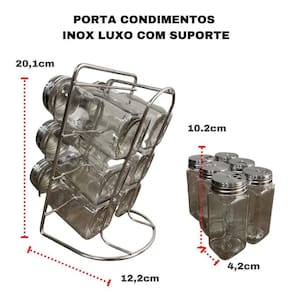 Buscando um utensílio elegante e prático para manter seus condimentos e temperos sempre organizados Apresentamos o Porta-Condimentos de Aço Inox com Suporte Fixo e 6 Potes de Vidro, perfeito para proporcionar funcionalidade e requinte à sua cozinhaOrganização e Estilo: Tenha seus temperos favoritos sempre à mão e bem organizados, adicionando um toque de sofisticação à sua cozinha com este porta-condimentos de design moderno em aço inox.Qualidade e Durabilidade: Fabricado em aço inox, o porta-condimentos oferece maior resistência e durabilidade, além de ser fácil de limpar. Os potes de vidro com tampas em aço inox garantem qualidade e praticidade no armazenamento de seus temperos.Suporte Fixo: O suporte fixo de aço inox permite acomodar os 6 potes de vidro de forma segura e eficiente, facilitando o acesso aos temperos e condimentos durante o preparo das refeições.Conteúdo da Embalagem: O conjunto inclui 1 suporte fixo de aço inox e 6 potes de vidro com tampa em aço inox, proporcionando espaço suficiente para guardar seus condimentos essenciais.Não perca tempo e adquira já o seu Porta-Condimentos de Aço Inox com 6 Potes de Vidro Sua cozinha mais organizada e sofisticada com um simples clique. Compre agora