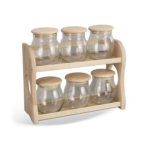 Os potes de vidro possuem tampas herméticas que preservam o aroma e sabor dos alimentos, enquanto o suporte de madeira oferece um toque natural e sofisticado à sua bancada ou prateleira. Perfeito para quem gosta de manter tudo bem organizado e com estilo.