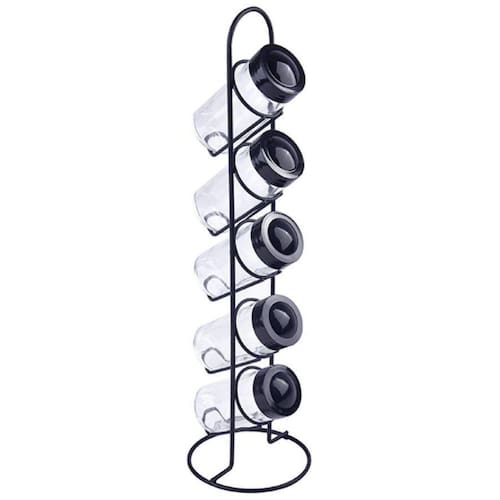 Porta temperos condimentos suporte metal preto 5 potes vidro Porta condimentos tempero com suporte metal 5 peças preto Porta condimentos 5 peças com suporte aramado, ideal para organizar temperos e deixar sua cozinha mais bonita e organizada. Fácil de limpar, design sofisticado e elegante, que pode ser também como item decorativo. Os 5 recipientes de vidro com tampa rosqueável proporcionam bom armazenamento e fácil visualização. Características: Material: suporte de metal / porta condimento: vidro Capacidade de cada pote: 90 ml Dimensões do produto: 11 cm de comprimento x 11 cm de largura x 39 cm de altura Capacidade: 01 suporte + 5 portas condimentos Marca: Não Informado Ean: 7899658310042