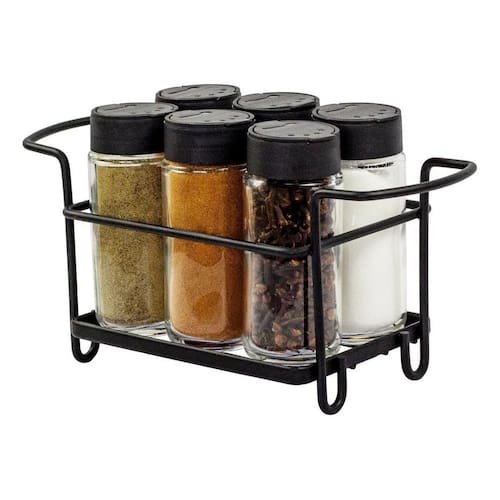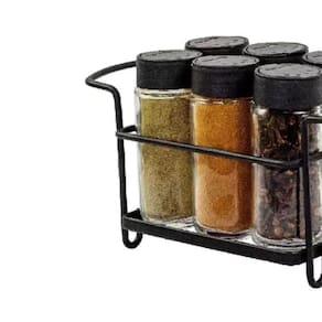 Porta Temperos E Condimentos Aço Preto 6 Potes 7476 Passerini Suporte para temperos na cor preta, acompanhado de 6 frascos de vidro transparente para organização de condimentos, com fácil acesso. O conjunto tem um design moderno que se harmoniza com a decoração da cozinha.
