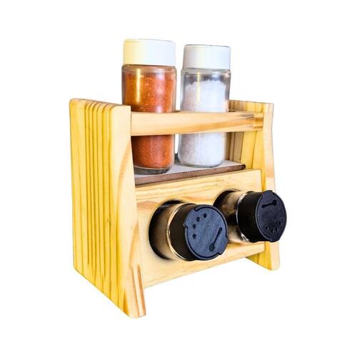 Dimensões do Porta Temperos Gibraltar: Altura: 19,5 cm Largura: 10 cm Comprimento: 16,5 cm Material: Madeira de Pinus tratada especialmente, vidro reforçado e plástico de alta qualidade e durabilidade. Quantidade e Capacidade dos potes: 4 potes, 100ml tampa dosadora dupla.