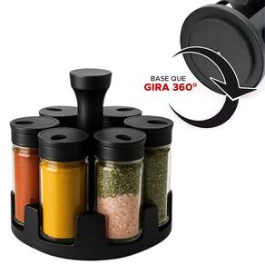 Porta Temperos Giratório 360° com 6 Potes de Vidro Premium de Vidro 85ml - Tampa Dosadora Preta Belovidro - PANAMI