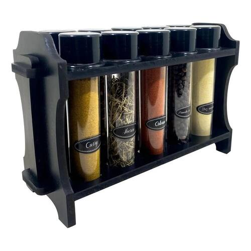 Conteúdo da embalagem. - 01 suporte de madeira mdf - 10 tubetes plástico translúcido - 10 tampas plástico na cor preta. - 24 adesivos com os nomes de alguns temperos já impressos. - o produto não acompanham os temperos.