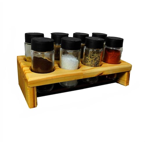 Itens inclusos:- 1 base fixa em painel tratado de pinus.- 8 potes em vidro com tampa em plástico.